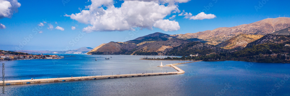 Aerial view of the De Bosset Bridge in Argostoli city on Kefalonia island. De Bosset Bridge on lakeside In Argostoli, Kefalonia. Obelisk and the de Bosset bridge in Argostoli, Kefalonia, Greece