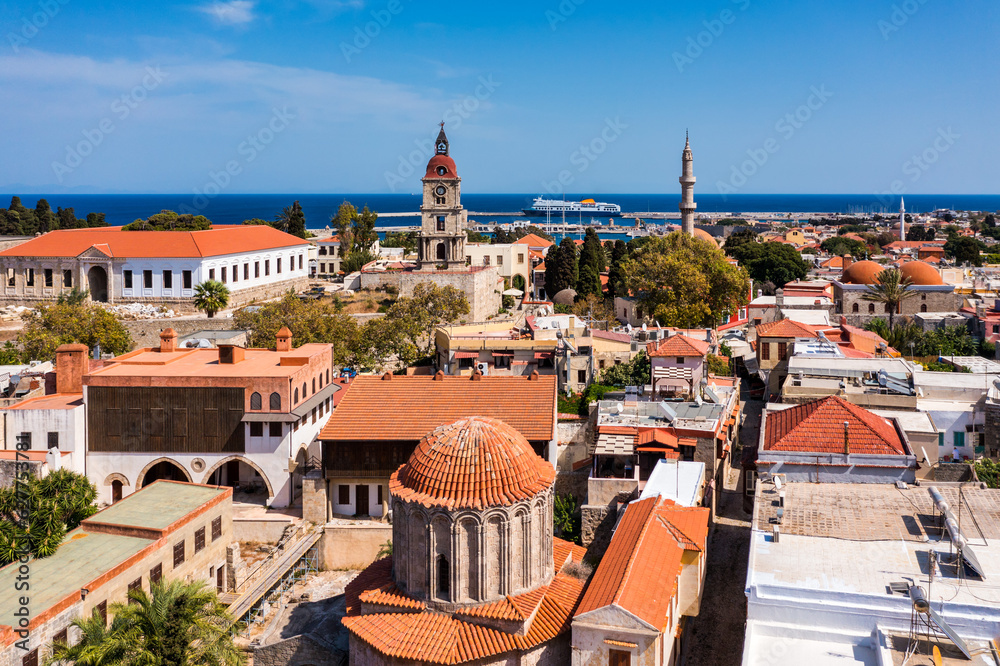 Panoramic view of Rhodes old town on Rhodes island, Greece. Rhodes old fortress cityscape with sea port at foreground. Travel destinations in Rhodes, Greece.