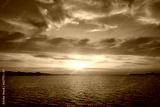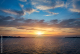 Drone flying over sea in a beautiful sunset in Adriatic sea. Aerial drone shoot. Sunrise over the sea. Colorful sunset on the Adriatic Sea, Croatia.