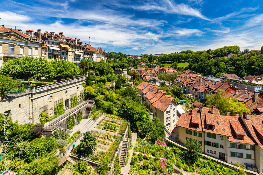 View of the Bern old city center and Nydeggbrucke bridge over river Aare, Bern, Switzerland. Bern old town with the Aare river flowing around the town on a sunny day, Bern, Switzerland.