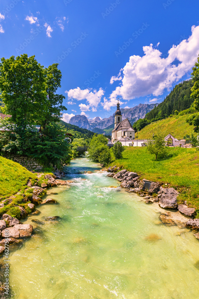 Parish Church of St. Sebastian in the village of Ramsau, Nationalpark Berchtesgadener Land, Upper Bavaria, Germany. Colorful view of Parish Church of St. Sebastian, Ramsau bei Berchtesgaden, Germany.