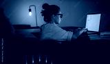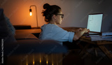 Young woman working at home at night on a project using a laptop. Problems with long hours workaholism