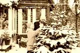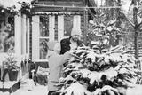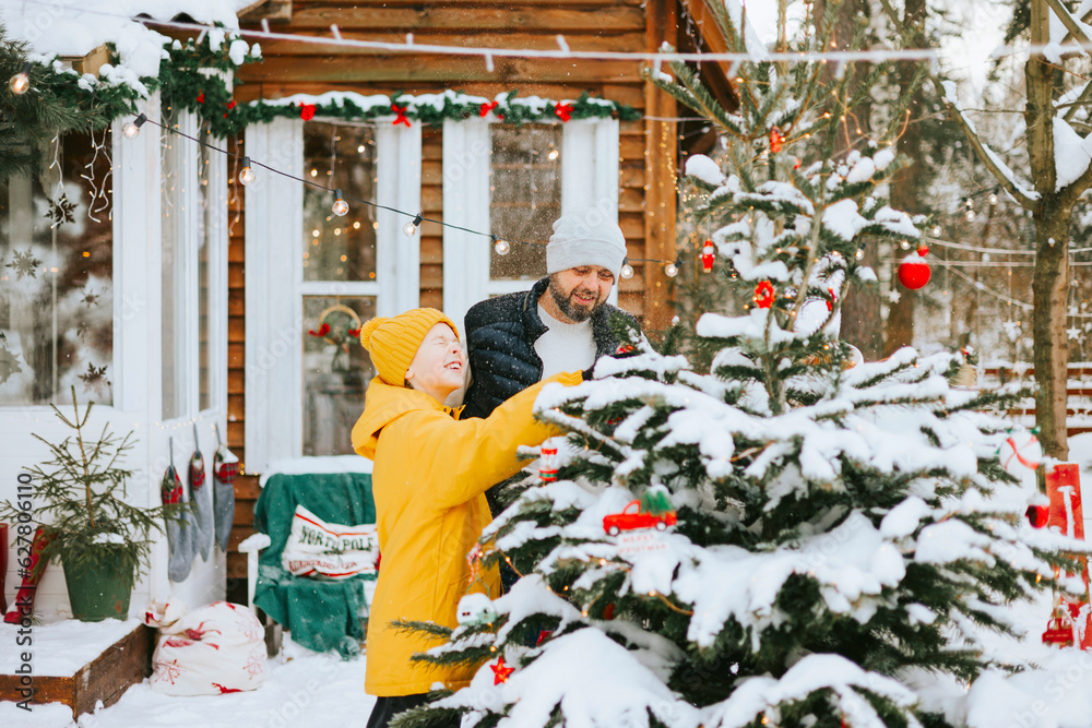 family dad and cute teenage boy decorate Christmas tree near front door porch of village countryside house decorated for Christmas winter holidays, Christmas and New year vacation concept