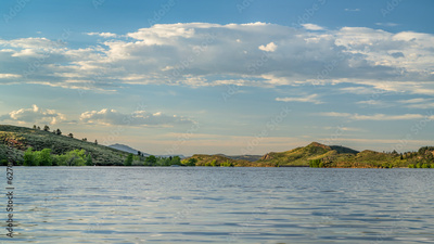 summer scenery of Horsetooth Reservoir in Colorado with some distant boats