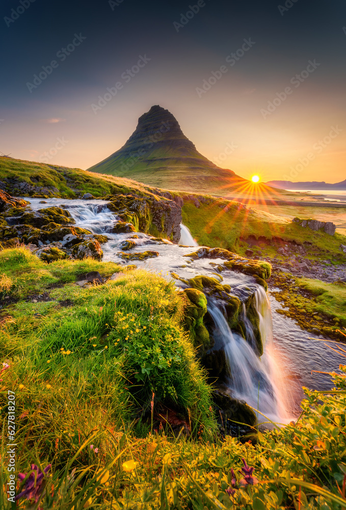 Sunrise over Kirkjufell mountain with waterfall flowing and wildflower blooming in summer at Iceland