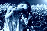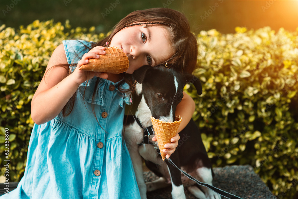 A cute little girl of European appearance sits in the park on a bench with her funny dog and feeds him ice cream
