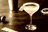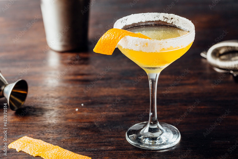 Yellow Sidecar Cocktail booze brandy, triple sec liqueur and fresh lemon juice with a Sugar Rim