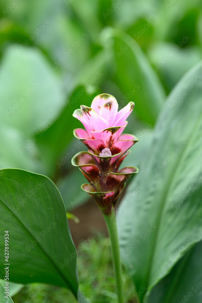 Pink Curcuma alismatifolia flower or Siam tulip blooming in rainy season, Thailand