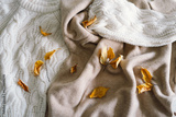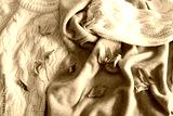 Background with warm sweaters. Pile of knitted clothes with autumn leaves, warm background, knitwear, space for text, Autumn winter concept. Copy Space.
