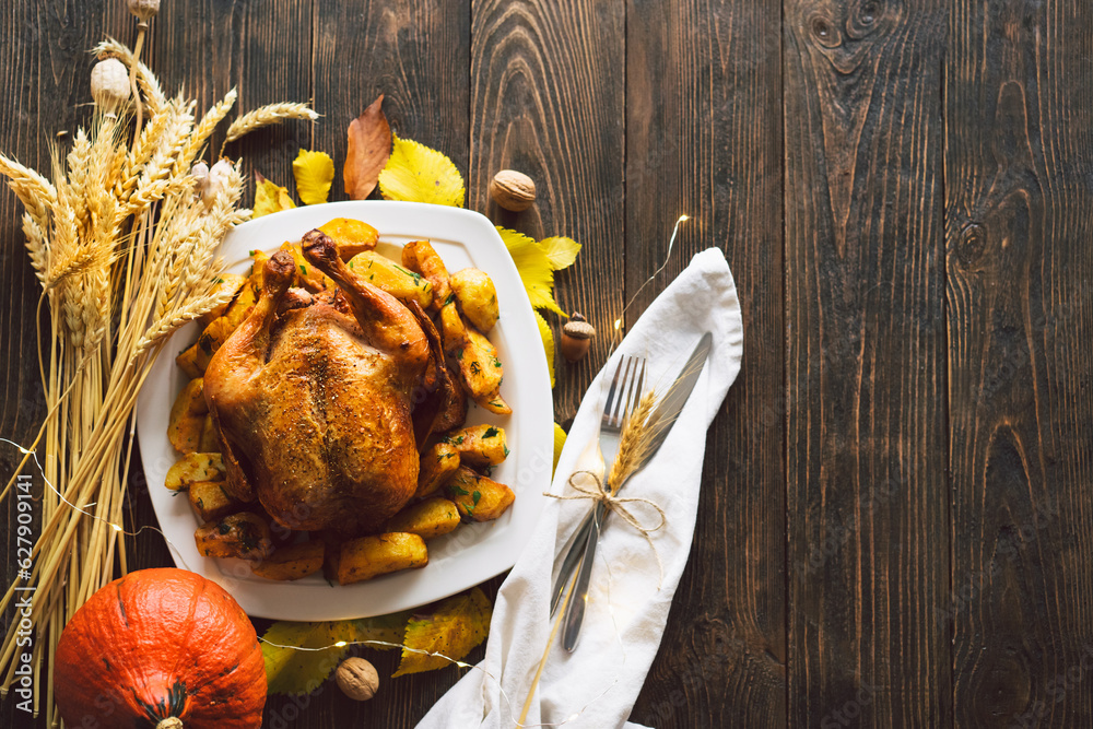 Happy Thanksgiving. Autumn composition with leaves, ripe pumpkin and Thanksgiving turkey on a dark wooden table. Top view.