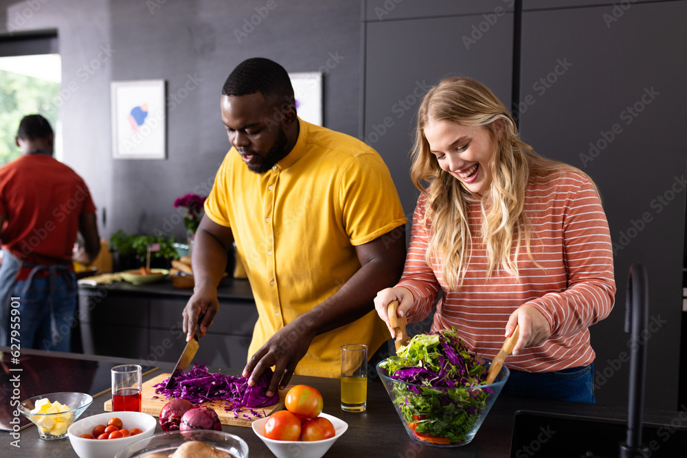 Happy diverse group of friends cutting vegetables on countertop in kitchen