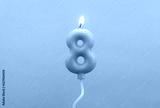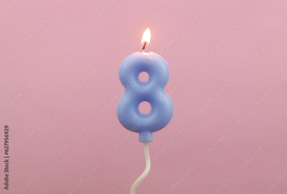 Air balloon shaped birthday candle burning on pink background. Number 8.
