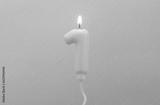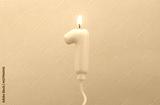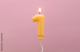 Air balloon shaped birthday candle burning on pink background. Number 1.