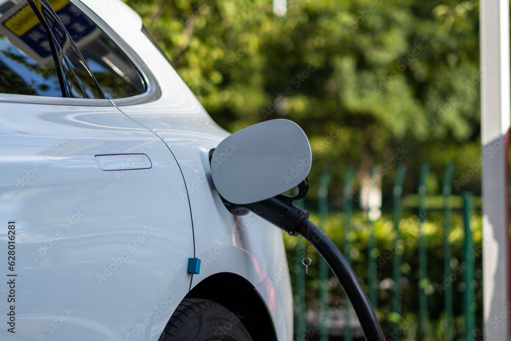 Electric car is charging in the parking lot