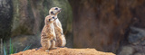 Two curious meerkats stand on their hind legs on a sandy hill and look away.