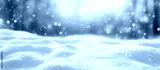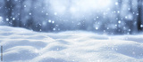 Winter snow background with snowdrifts, with beautiful light and snow flakes on the blue sky in the evening, banner format, copy space.