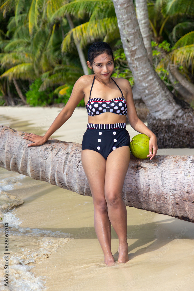 A cute girl in retro swim-dress with coconut on the tropical beach.