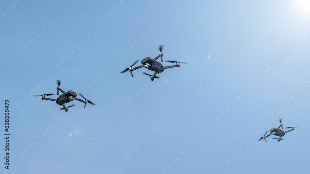 Three surveillance drones in front of blue sky