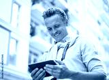 Happy man reading latest news articles from tablet PC while being outdoors on city street. Tablet PC in his hands allows him to access the latest information and stay up-to-date with current events.