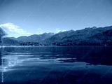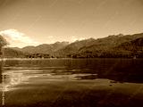 Mountain reflection on wavy water surface of lake Bohinj on a sunny summer day.