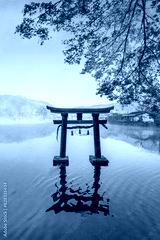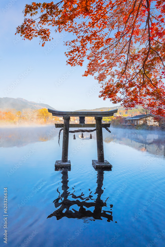 Yufuin, Japan - Nov 27 2022: Tenso-jinja shrine at lake Kinrin, is one of the representative sightseeing spots in the Yufuin area at the foot of Mount Yufu.