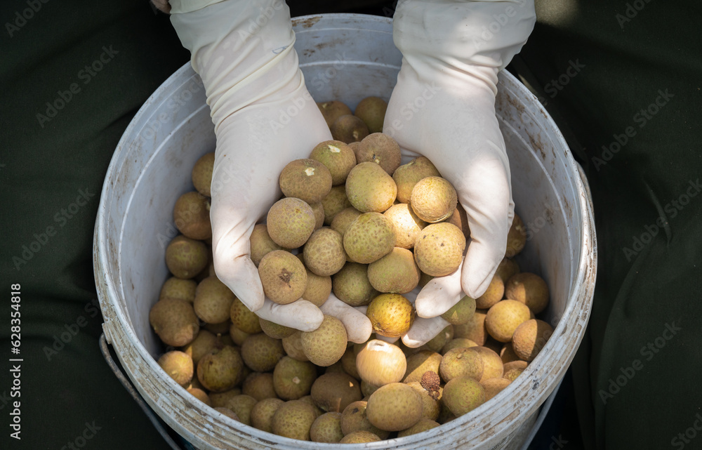 Gardener holding group of Longan after harvesting. Longan is a tropical fruit native to Southeast Asia that's a member of the soapberry family.