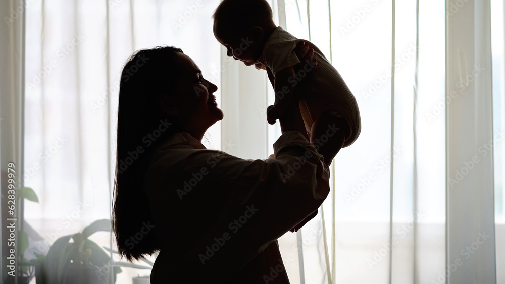 Mother tosses daughter against window and kisses baby girl in bedroom. Parent silhouette playing with delighted infant girl