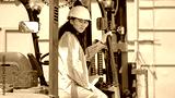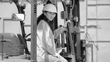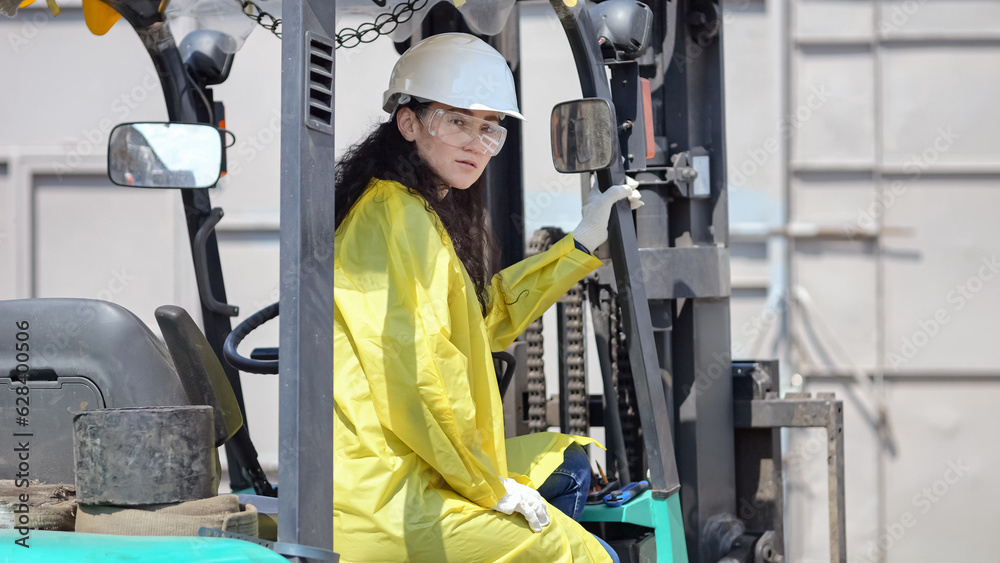 Black-haired woman sits in excavator for trash transporting at big waste sorting plant. Female manager checks durability of apparatus in factory