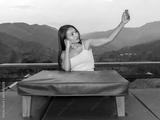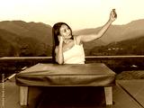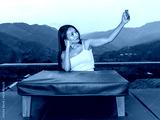 A young woman with a mobile phone takes a selfie on the porch at sunset over the valley