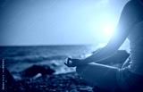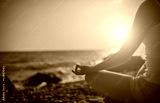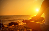 hand of woman meditating in a yoga pose on beach at sunset