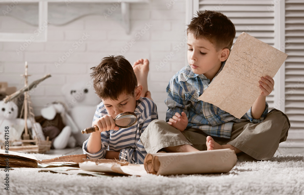 Two boys studying old maps Travel