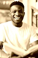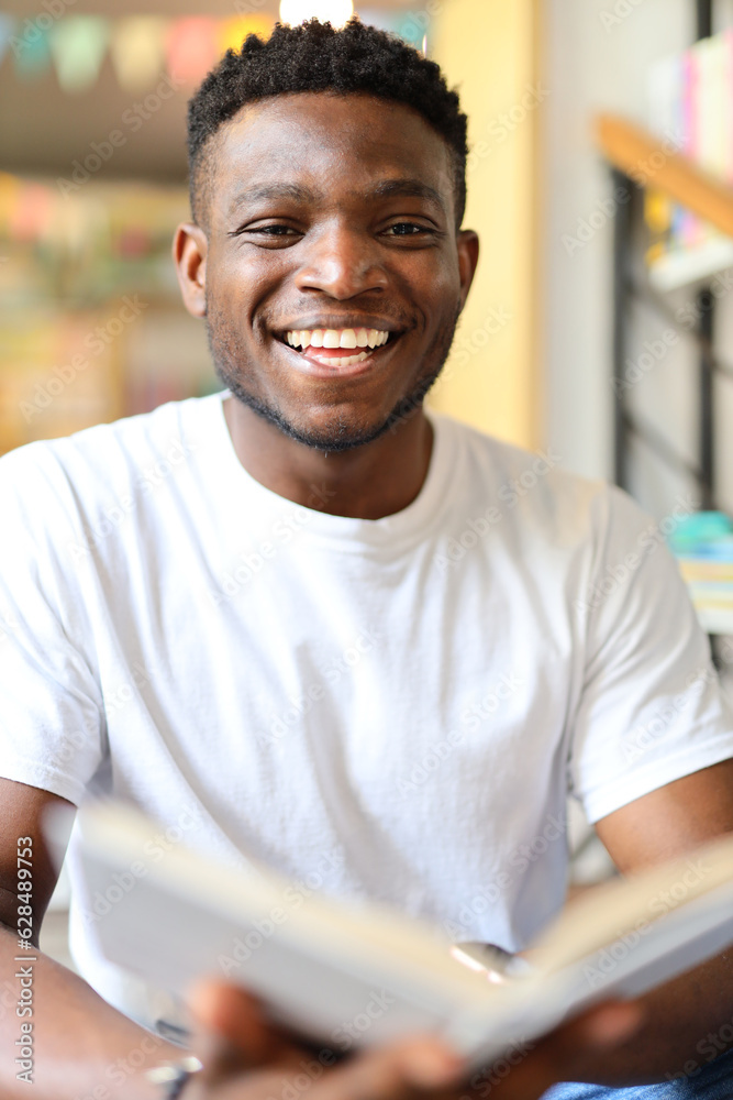 Handsome African American man wearing a white t-shirt and holding a book. He is a young and smart student, learner or fashion who is smiling, laughing or looking for his education.