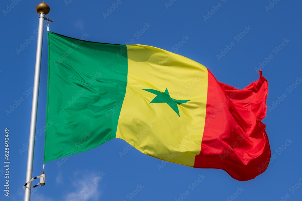 Senegal flag in the blue sky. horizontal panoramic banner. Close-up of waving the flag of Nigeria. Great photo for news illustrations.
