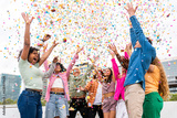 Happy playful multiethnic group of young friends bonding outdoors - Multiracial millennials students meeting in the city, concepts of youth, people lifestyle, diversity, teenage and urban life