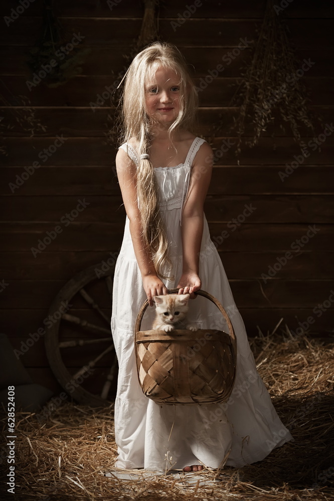 Girl with a kitten in a basket