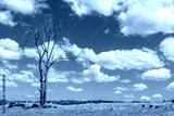 Dead skeleton eucalyptus trees in Tasmania, Australia. Summer sky background. Summer landscape in the Tasmanian Highlands.