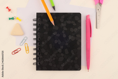 Empty copy space blank paper card on beige neutral table. Art home office desk workspace. Flat lay, top.