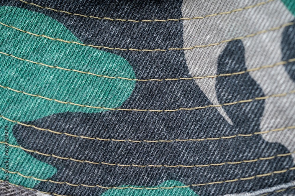 Close up of textured camouflage military uniform of soldier. In military use, camouflage is an appearance designed to hide soldiers and equipment on the ground.