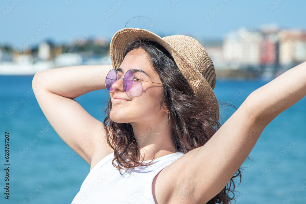 relaxed free woman breathing fresh air outside