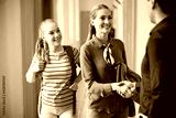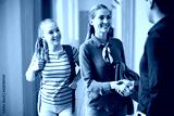 Happy mother with teenage daughter greeting high school principal in hallway.