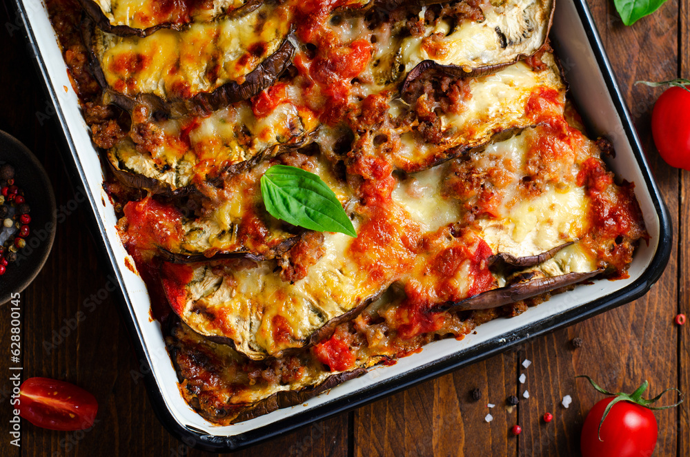 Eggplant Casserole, Roasted Eggplant Dish with Minced Meat, Tomato Sauce and Mozzarella over Rustic Background