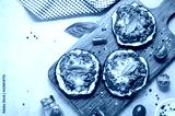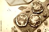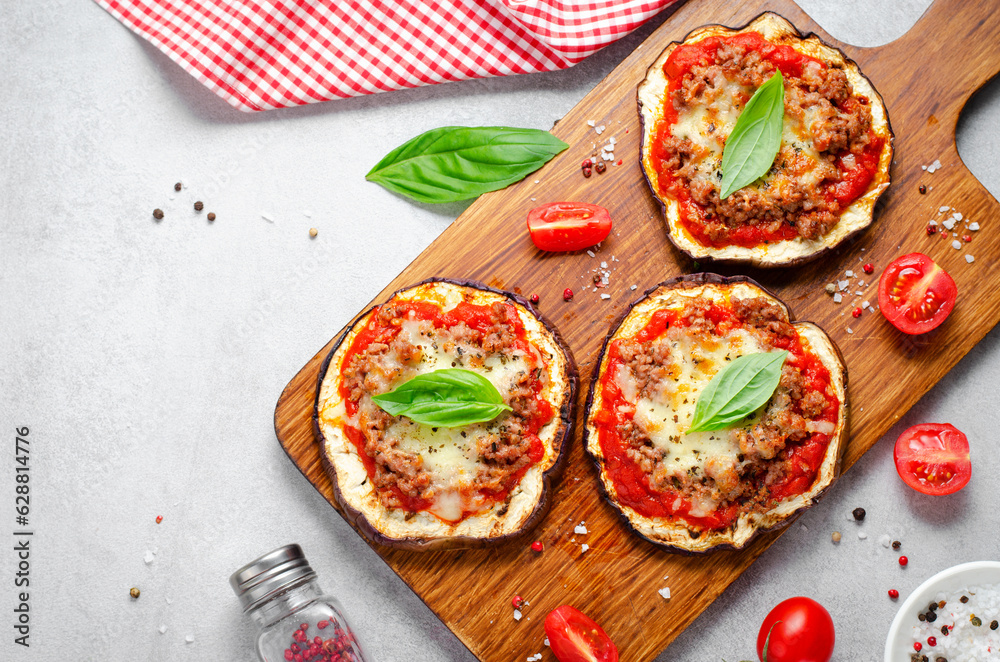 Eggplant Pizza with Tomato Sauce, Minced Meat, Mozzarella and Basil, Mini Vegetable Pizza over Bright Background
