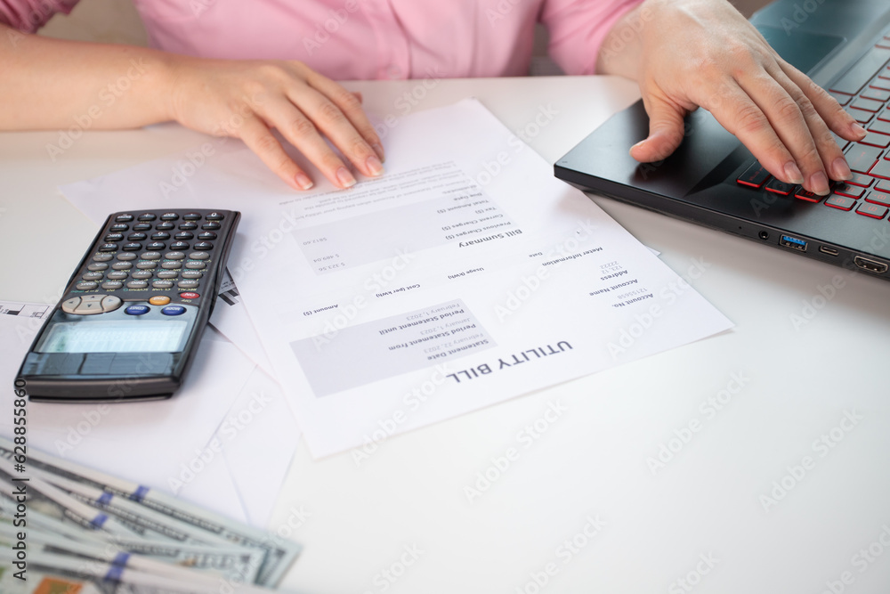 Utility bill, Invoice for energy consumption, electricity and gas receipt, a woman behind a worker considers the budget for utilities,