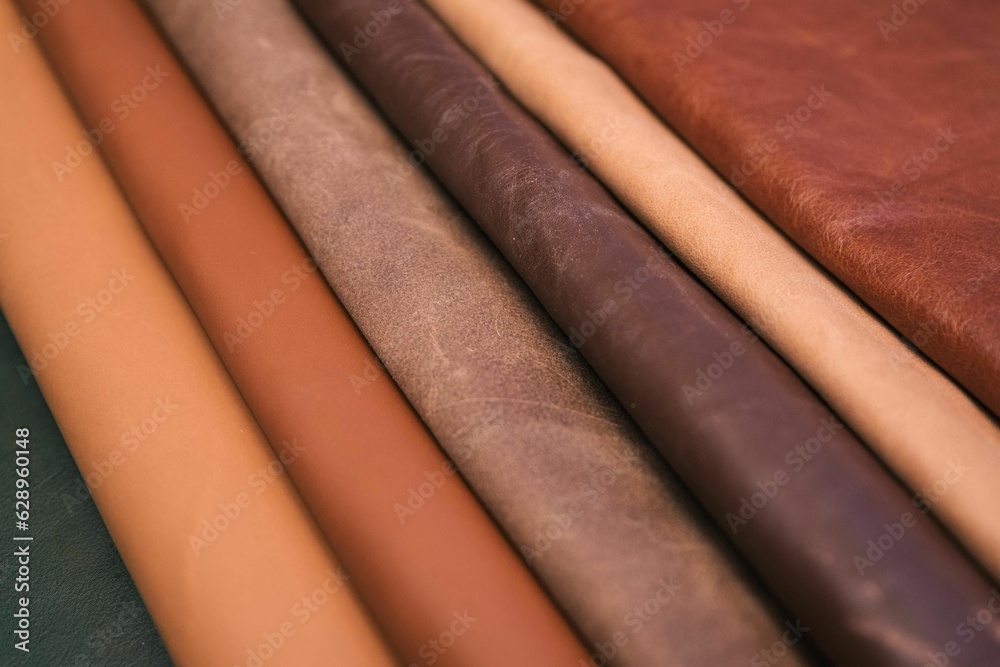 Array of leather fabric samples in different shades neatly placed on a table, ready to be crafted