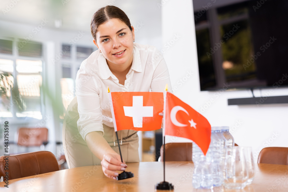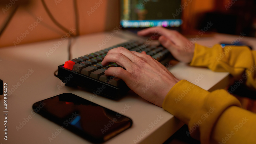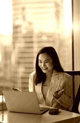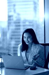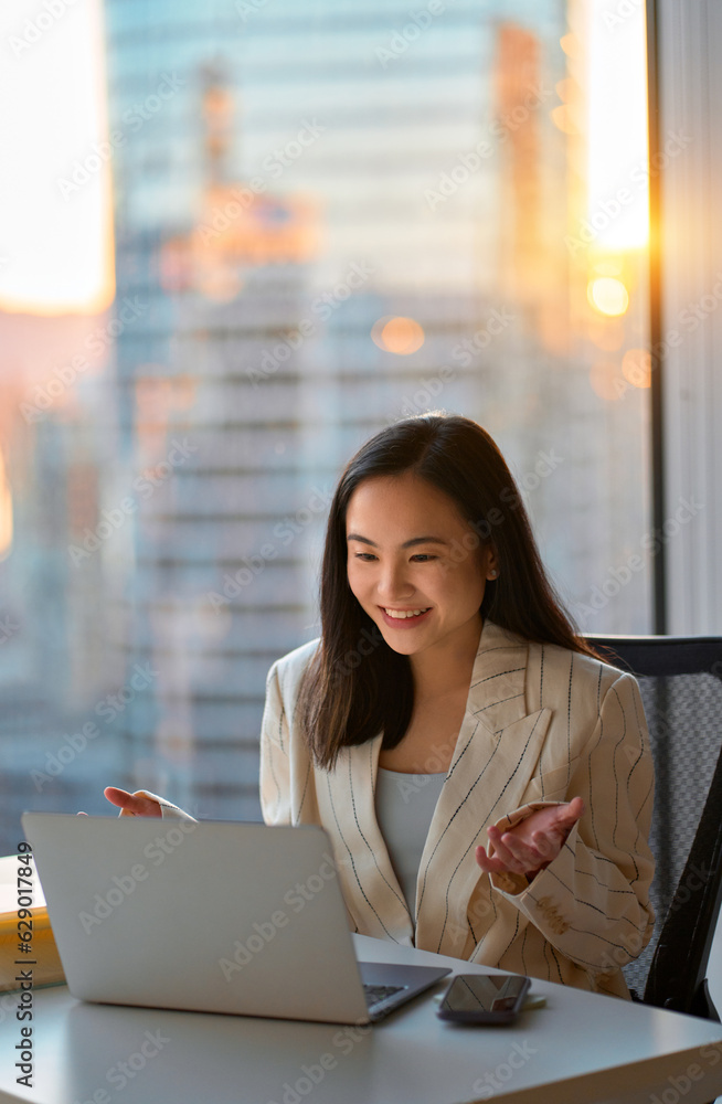Young happy Asian woman executive team leader or hr manager having virtual video conference call meeting communicating by videocall on laptop in office feeling excited by online work results.