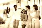 Group of university students hugging and walking outdoors the college campus. They laugh and hold folders.It is a multiracial team having fun. Community and friendship