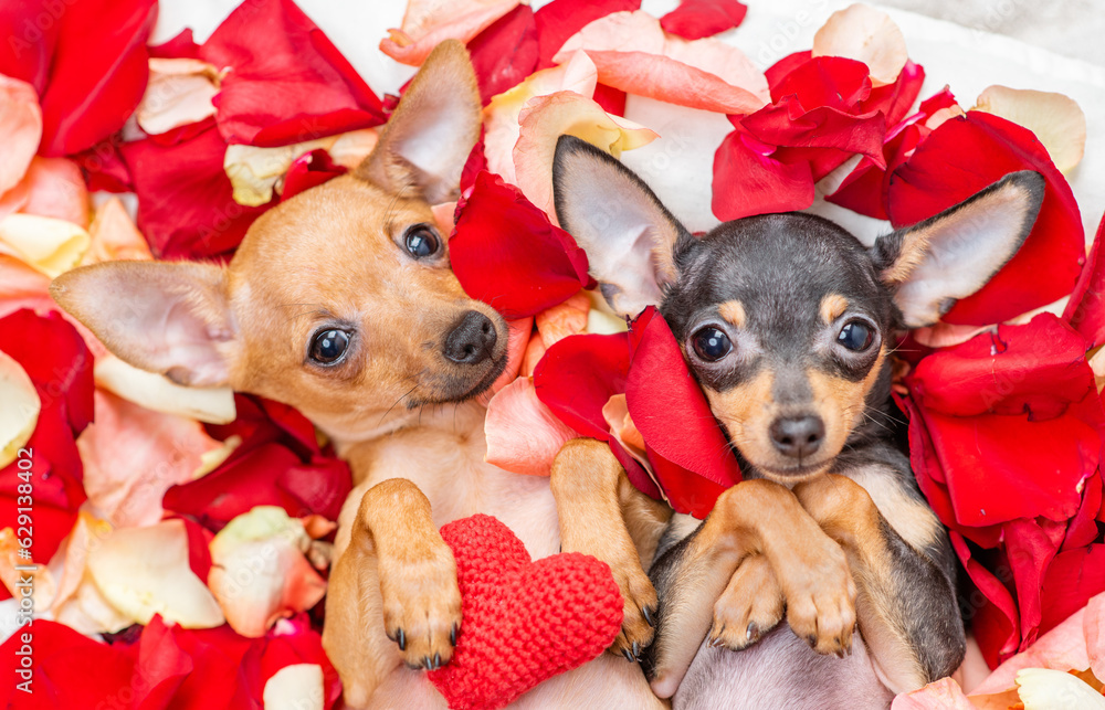 Two toy terrier puppies hold red heart and lie on petals of the rose flower