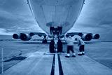 Low angle view of freight airplane. Ground staff at airport. Preparation cargo plane before flight during sunny day..