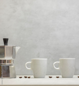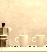 Metal geyser coffee maker on table with cup