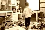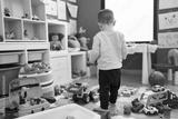 Adorable hispanic boy playing with car toy standing at kindergarten